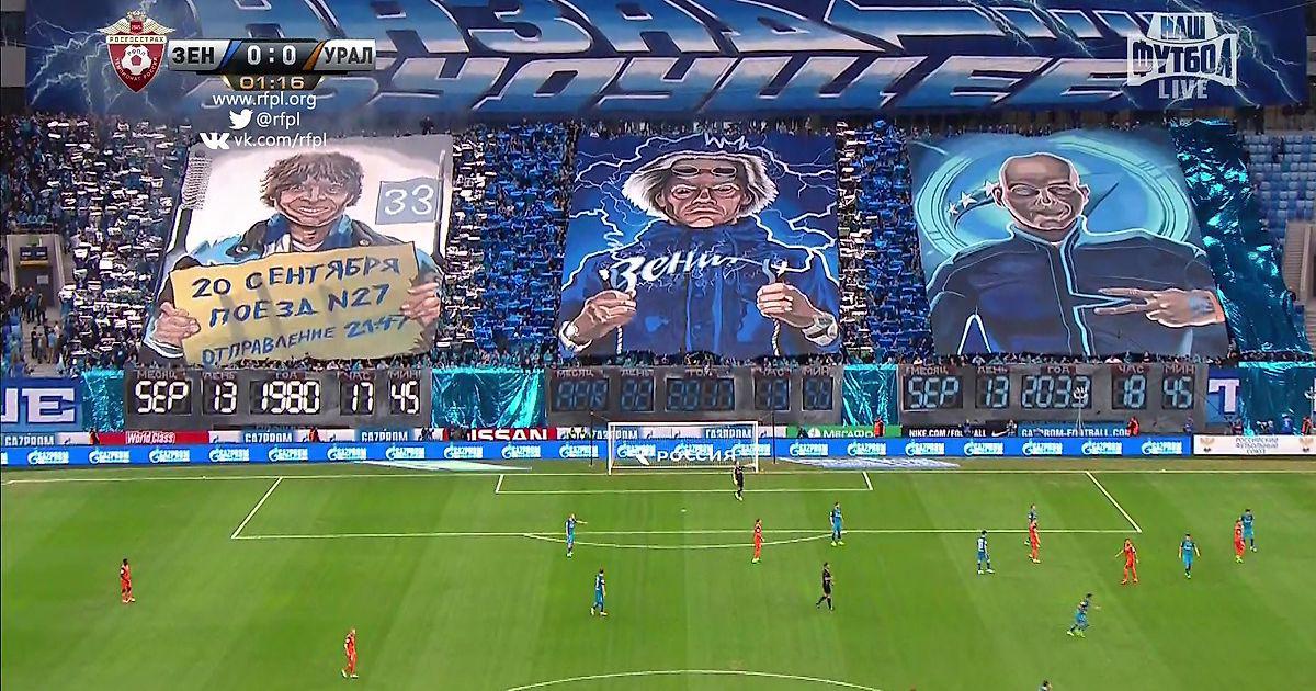 Осенью 1980 года фанаты "Зенита" с 33-го сектора стадиона имени Кирова впервые отправились на организованный выезд. 20 сентября 1980 года считается днем рождения фан-движения "Зенита". "Санкт-Петербург Арена" построена на месте стадиона имени Кирова. Фанаты вернулись в родной дом. Перфоманс выполнен в стиле популярных фильмов "Назад в будущее" и "Стар Трек".