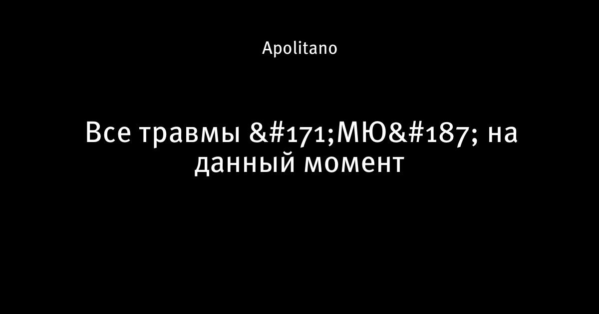 25 апреля 2017, 03:40 Все травмы «МЮ» на данный момент Автор Apolitano Этот пост опубликован в блоге на Трибуне Sports.ru. Присоединяйтесь к крупнейшему сообществу спортивных болельщиков! Другие посты блога United Tweets премьер-лига Англия Манчестер Юнайтед