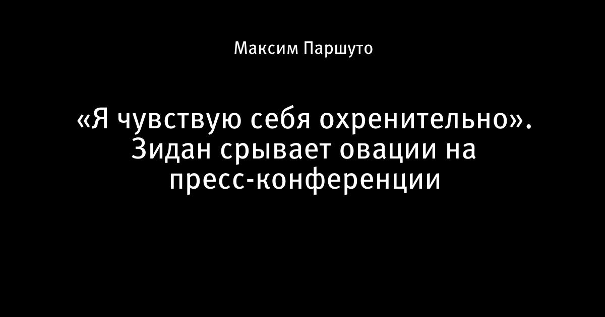 29 апреля 2017, 12:51 «Я чувствую себя охренительно». Зидан срывает овации на пресс-конференции – Как вы себя чувствуете? – Я чувствую себя охренительно! Автор Максим Паршуто Этот пост опубликован в блоге на Трибуне Sports.ru. Присоединяйтесь к крупнейшему сообществу спортивных болельщиков! Другие посты блога Тейлор Свифт видео Зинедин Зидан Реал Мадрид Ла Лига