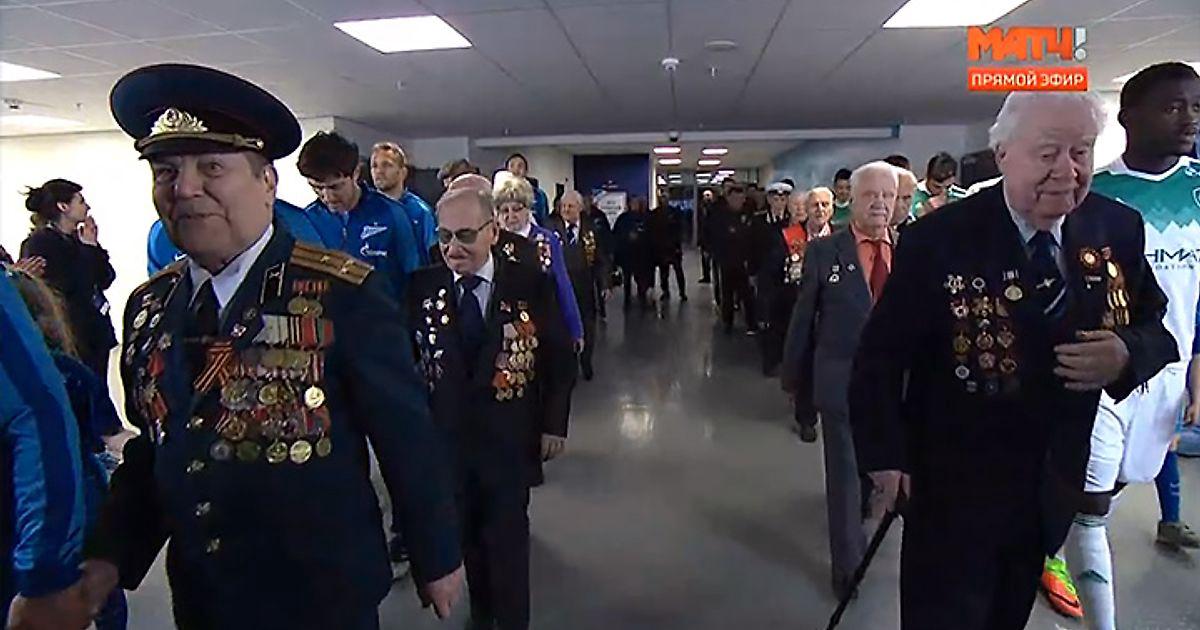 Трогательная церемония прошла перед началом матча «Зенит» – «Терек». Ветераны Великой Отечественной войны вывели на поле «Крестовского» футболистов обеих команд.