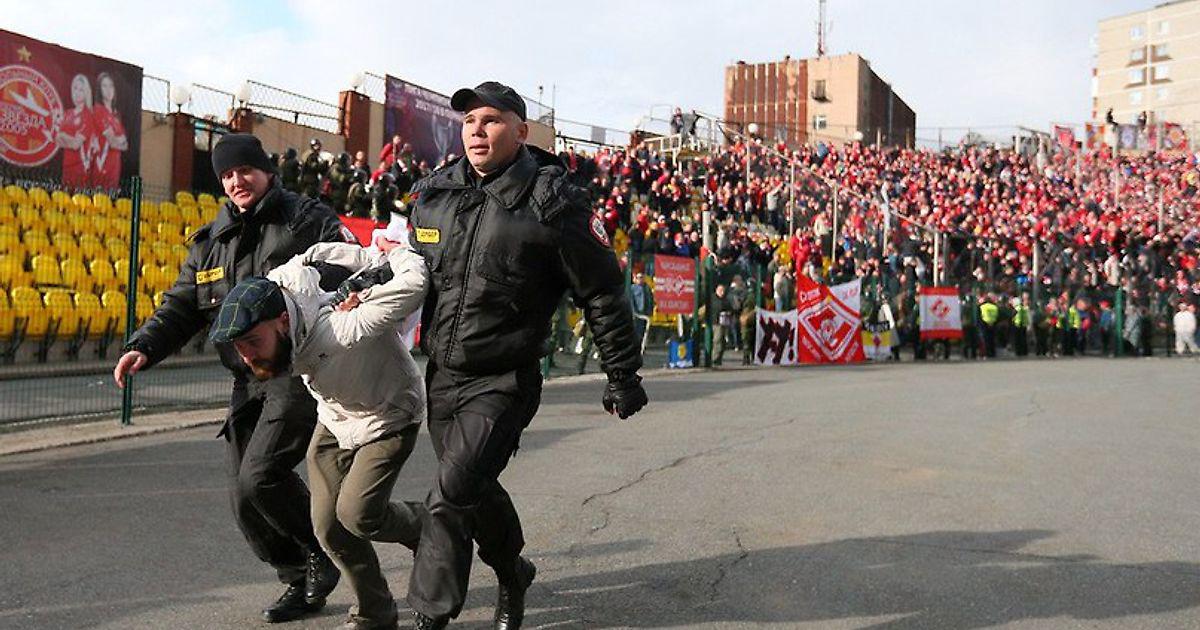 Пересмотрите видео. Это не мент, а солдат срочник МВД со щитом стоял в оцеплении и не пускал братву на поле и парниша тот, которого ведут на фото, вступился, обхватил сзади и оттащил его в сторону, а у того бронежилет надет, ну и он и потерял равновесие и грохнул на землю, шлепок ещё характерный.