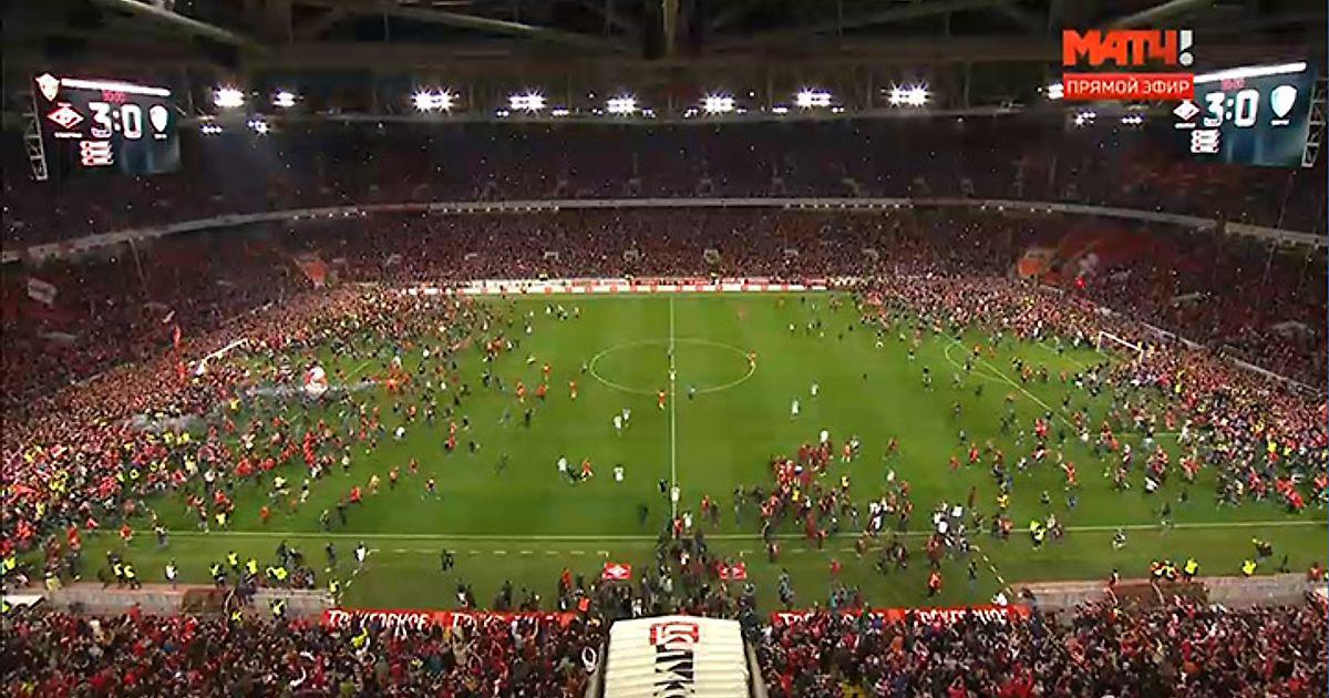 Сразу после матча «Спартак» – «Терек» болельщики красно-белых поспешили на поле, чтобы отпраздновать чемпионство с игроками и тренерами команды.