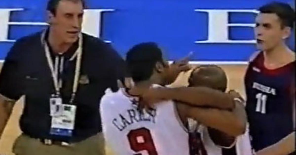 ...это копия легендарной стычки между сборными США и России на Олимпиаде-2000, когда хотели побить Винса Картера: То же столкновение Захара Пашутина, тот же палец в лицо, то же появление в кадре старшего брата.