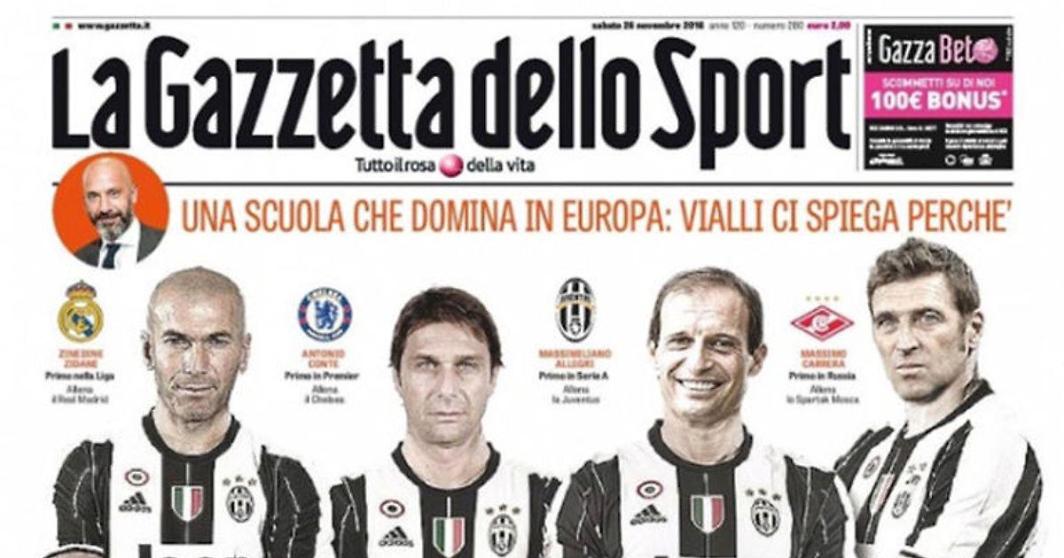 Пройдет четыре года, и в конце 2016-го на первой полосе самой авторитетной итальянской спортивной газеты, La Gazzetta dello Sport, будет опубликован коллаж с фотографиями четырех тренеров, лидировавших на тот момент в национальных чемпионатах, – Антонио Конте из "Челси", Зинедина Зидана из "Реала", Массимилиано Аллегри из "Ювентуса" и Массимо Карреры из "Спартака". Все – в черно-белых майках "Старой синьоры", символизируя победный дух "Юве", которым пропитываются тренеры, когда-либо за него выступавшие. Конечно, когда я спрашиваю об этом Карреру, выясняется, что он этот коллаж видел.
