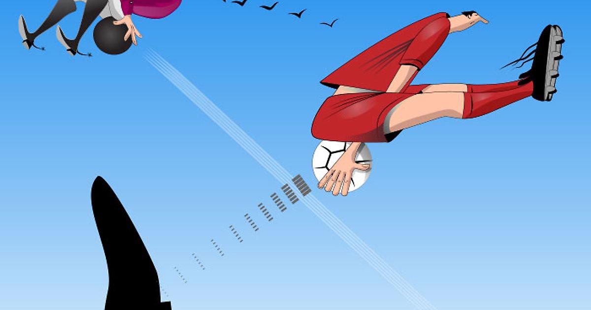 Для начала определяюсь с темой. Оглядываюсь по сторонам. Тема — под ногами: начало лета, а, значит, начало трансферного сезона. Что такое трансферный сезон? Это когда игроки переходят из одного клуба в другой. Иногда они перелетают, иногда — вылетают. Итак — идея! Игрок вылетает из клуба, но не на самолёте, а на мяче как Барон Мюнхгаузен. Делаю быстрый скетч чернилами и карандашами, чтобы определиться с позой, ракурсом. Вот так пусть летит игрок.
