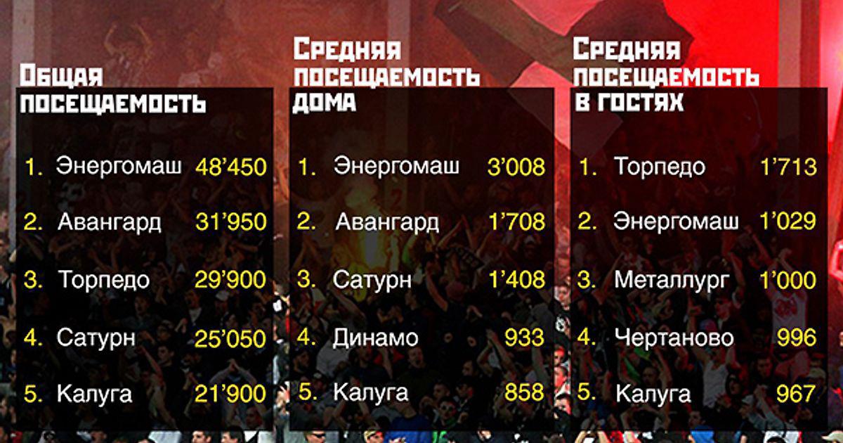 3 июня 2017, 20:48 Итоги посещаемости первенства ПФЛ (зона «Центр»). «Энергомаш», «Авангард» и «Торпедо» в лидерах Автор Константин Торопкин Этот пост опубликован в блоге на Трибуне Sports.ru. Присоединяйтесь к крупнейшему сообществу спортивных болельщиков! Другие посты блога Torpedo News Торпедо Чертаново ФК Калуга Авангард Курск Металлург Липецк Динамо Брянск Леон Сатурн ПФЛ Россия Энергомаш болельщики