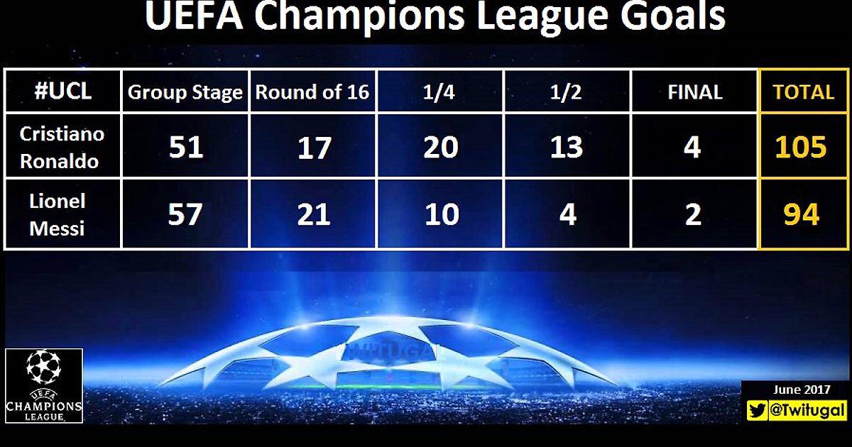 Сравнение голов Месси и Роналду в Лиге Чемпионов по стадиям