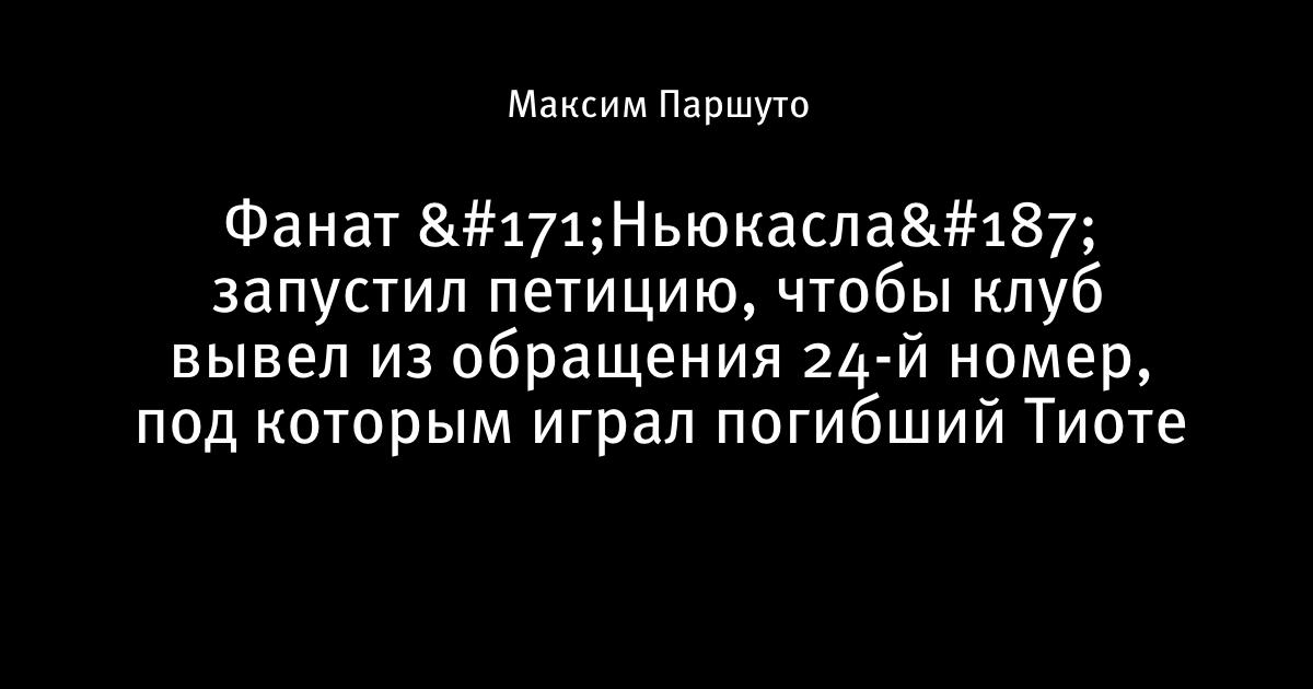 9 июня 2017, 13:26 Фанат «Ньюкасла» запустил петицию, чтобы клуб вывел из обращения 24-й номер, под которым играл погибший Тиоте Автор Максим Паршуто Этот пост опубликован в блоге на Трибуне Sports.ru. Присоединяйтесь к крупнейшему сообществу спортивных болельщиков! Другие посты блога Тейлор Свифт премьер-лига Англия Шейк Тиоте Ньюкасл