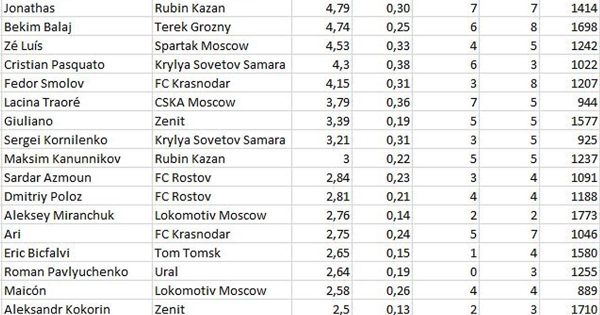 2) Смолов в топ xG всего лишь 7ой, что неудивительно из-за травм, много пропустил. По xG/90 минут также 7ой результат, а вот это уже интересно и является очередным подтверждением переоцененности Федора. Стоит пояснить почему так сильно различается место Смолова в этой таблице и таблице бомбардиров, здесь не учитываются пенальти и автоголы защитников.