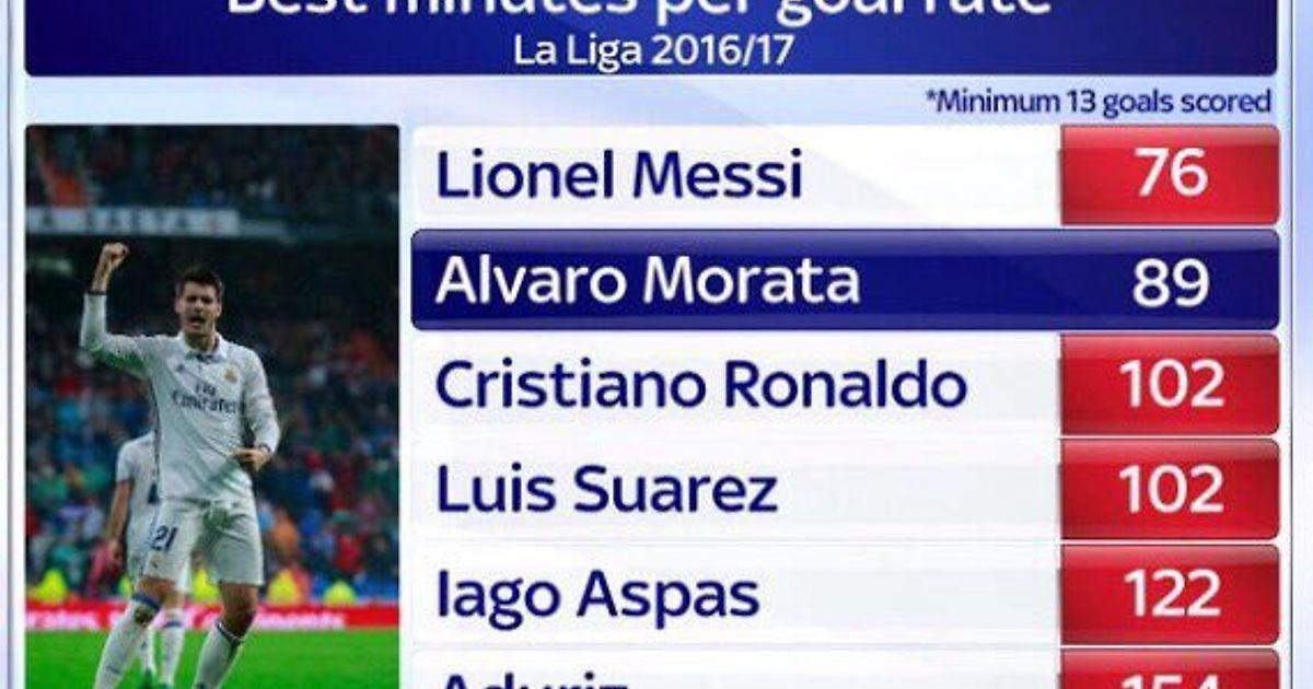 В сезоне 2016/17 Месси забивал гол каждые 76 минут, Мората - каждые 89.