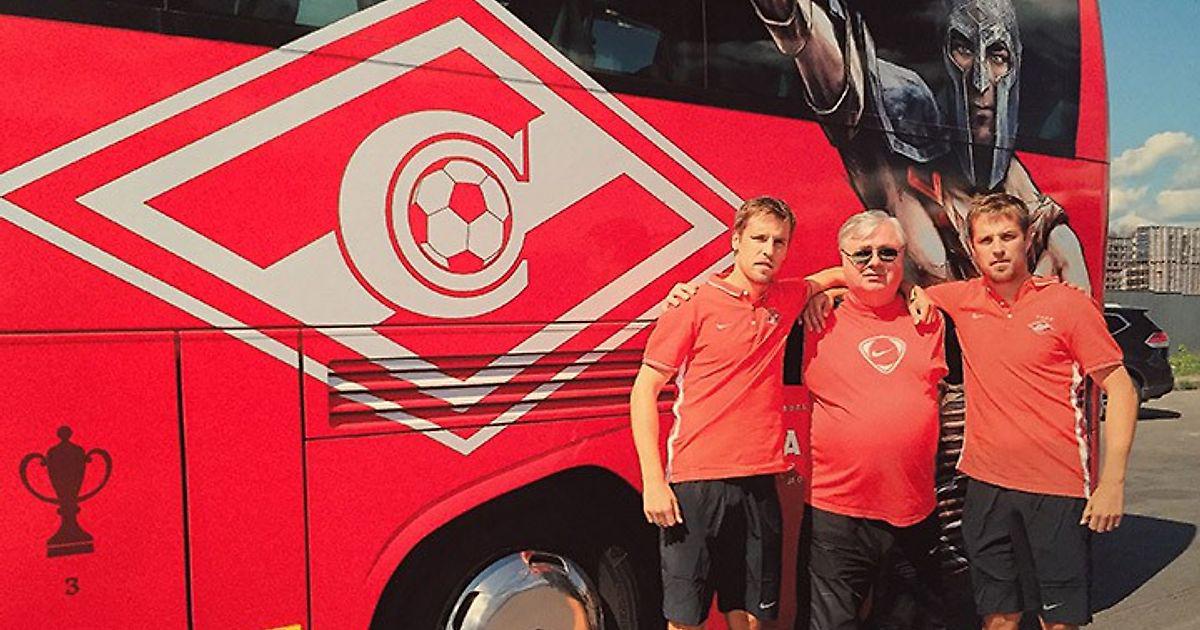 — Это и мой второй дом, и офис, и кафе — тут вся моя история. Вот, смотри, мальчишки первое чемпионство взяли. Вот я на фото с тем, ещё серебристым автобусом. Вот новый, красный. Хотя какой он новый?! Девять лет уже машине. Всё поменять собирались, тянули. «Валя, — говорили. – Ну если титул возьмём, точно обновим». В итоге, кажется, только меня обновили, автобуса чего-то я не вижу. — Знаешь, — продолжает Валентин. – Чемпионство-то начали праздновать уже после ЦСКА. Выиграли – и всё понятно стало, 10 очков отрыва. Глушаков прямо в раздевалке объявил: «Всех приглашаю в ресторан». Прямо на стадионе загрузились в автобус, поехали на набережную в «Лужники», по дороге пели песни, прыгали, веселились. Для водителя микрофон приспособлен – вот Дениска нашёл его, начал кричать, заводить. Хорошо было…