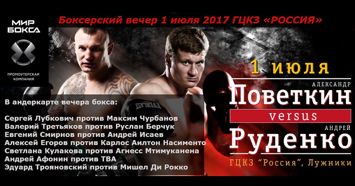 Вечер бокса ГЦКЗ - РОССИЯ - 1 июля 2017Вечер бокса - 8 поединков, основным событием которого станет поединок за титул чемпиона по версии WBO Inter-Continental среди тяжеловесов - Александр Поветкин vs Андрей Руденко