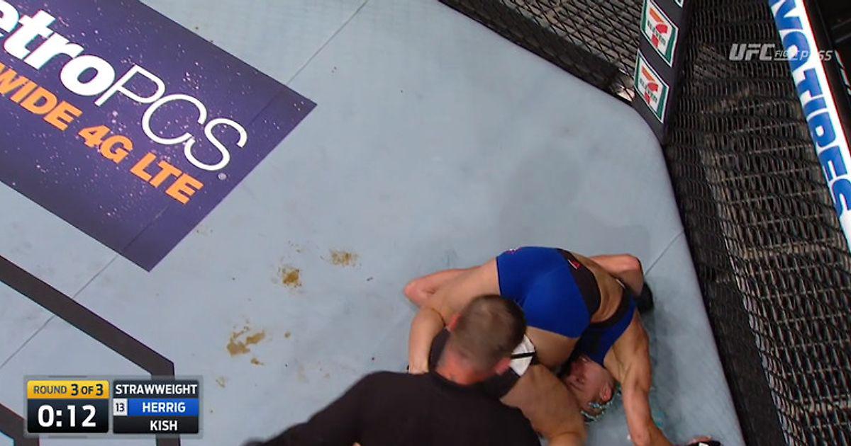 В третьем раунде поединка Херриг поймала Киш на очень плотный удушающий прием. Казалось, что шансов вырваться из него практически нет, но у Джастин получилось. Вскоре после этого обнаружилась цена ее стойкости – канвас оказался измазан калом бойца.
