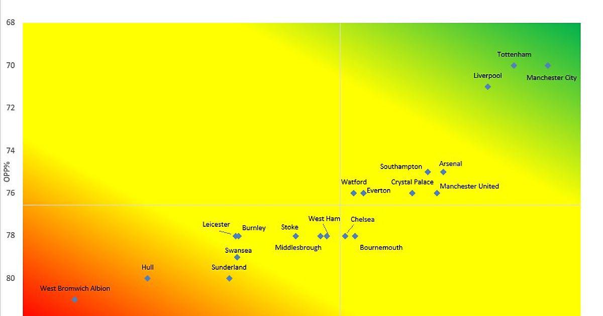 Наглядно показывает, кто и во что играет. Очевидно, что играющие в футбол команды - в правом верхнем углу. Остальным - большой привет. Показатели Челси о многом говорят.