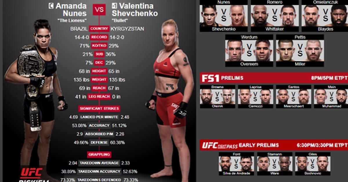 Аманда Нуньес (Бразилия\ тренируется во Флориде, США; 7-1 в UFC, действующий чемпион) vs #1 Валентина Шевченко (СССР\ тренируется в Перу, 3-1 в UFC), до 61,2 кг\ Bantamweight