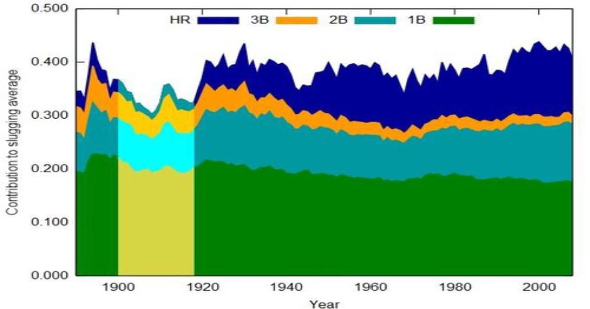 Несмотря на ничтожномалое количество хоумранов (у лидера вполне могло быть и менее 10 штук за сезон), этот период ознаменовался также вечным рекордом по количеству трипплов, -- 309 за карьеру у Сэма Кроуфорда (Sam Crawford). Этот парадокс, хорошо виден на графике ниже.