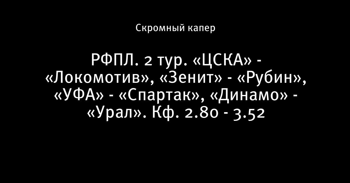 РФПЛ. 2 тур. «ЦСКА» - «Локомотив», «Зенит» - «Рубин», «УФА» - «Спартак», «Динамо» - «Урал». Кф. 2.80 - 3.52