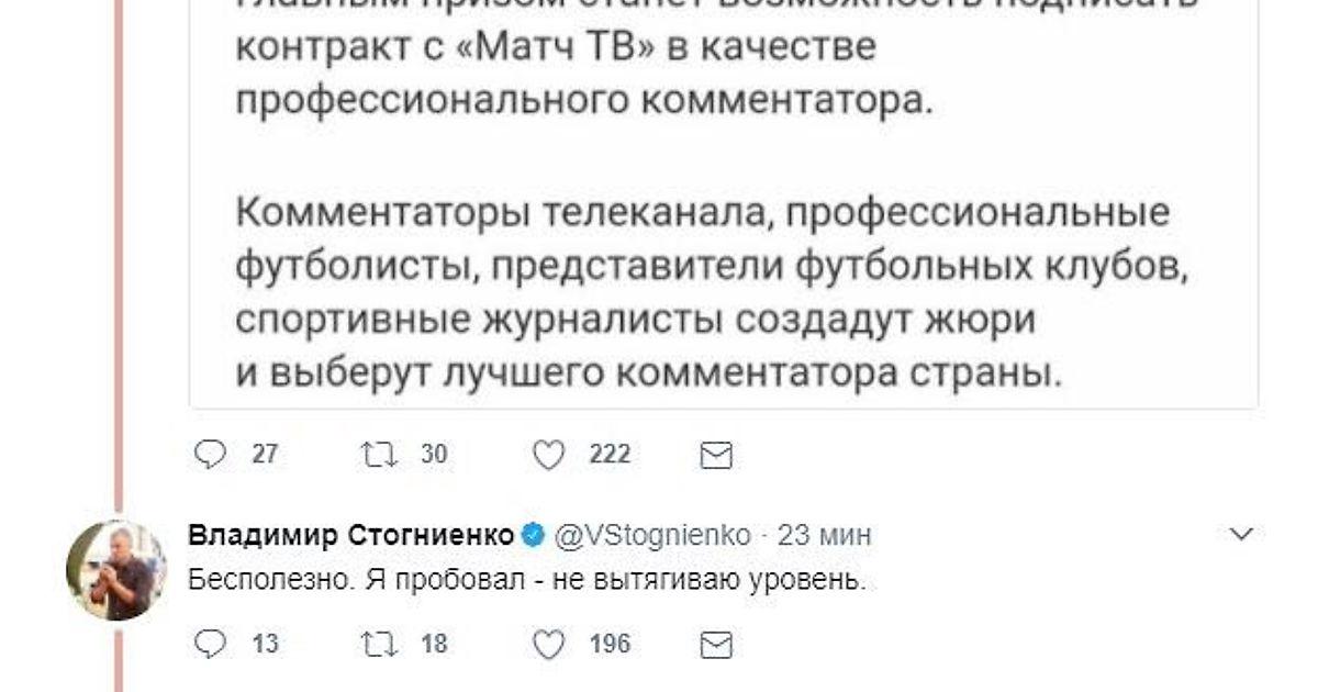 27 июля 2017, 21:14 Стогниенко и Уткин о конкурсе комментаторов на Матч ТВ Автор Александр Фадин Василий Уткин Матч ТВ Владимир Стогниенко