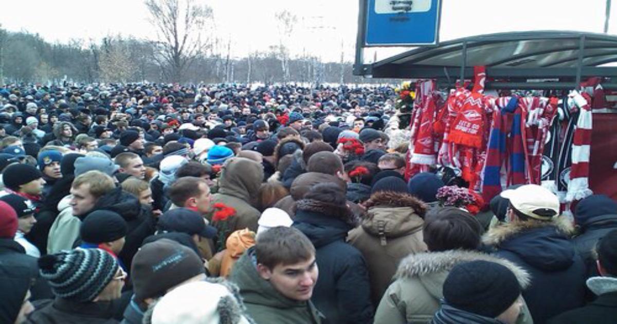 12:15 Участников акции становится с каждой минутой всё больше и больше. В основном это молодые люди девушки. Лица многих скрыты повязками и шарфами. Примкнувшие к участникам местные жители попытались сделать эмоциональное заявление "на камеру" одного из центральных телеканалов не по томе акции, но по просьбе болельщиков прекратили это.