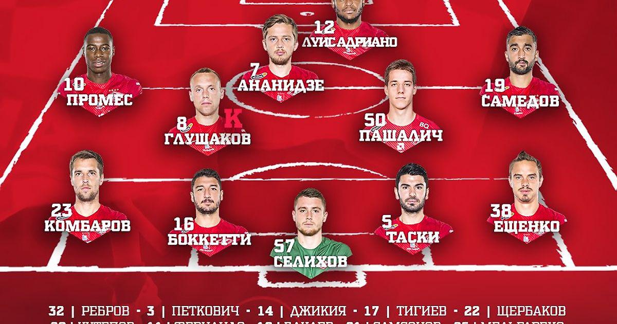 «Спартак»: Селихов, Ещенко, Таски, Боккетти, Комбаров, Пашалич, Глушаков (к), Самедов, Промес, Ананидзе, Луис Адриано.