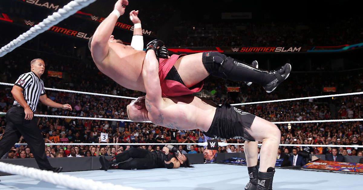Тринадцатый матч и главное событие SummerSlam: Брок Леснар (ч) против Брона Строумэна против Самоа Джо против Романа Рейнса — матч за титул Вселенной WWE Первым выходит Брон Строумэн. Публика встречает его хорошо. Следом идёт Самоа Джо. Такая же реакция и кричалка «Джо! Джо! Джо!». Выходит Рейнс, которого встречают гулом. Последним выходит чемпион, получая хорошую реакцию. Джо кричит на Леснара, мол, давай, заползай на ринг и отхвати лещей от меня. Джо обещает отправить его спать. Пол Хейман уже по традиции забирает микрофон у анонсера и объявляет Брока Леснара. Фанаты повторяют за ним слово в слово. Перед гонгом Брок поднял титул над головой и сделал круг по рингу перед претендентами. Джо и Строумэна выкидвыают с ринга. Схватка Леснара и Рейнса. Первый суплекс! Второй отхватывает Джо. На ринг поднимается Строумэн и фанатам это нравится. Но не тут-то было: вмешиваются Джо и Рейнс. Но Строумэн и Леснар раскидали их! Строумэн выкидывает чемпиона с ринга! Сзади нападает Рейнс, но Брон отбивается, однако неудачно атакует Рейнса и улетает с ринга. Джо в болевой стоя замывает Леснара, а Рейнс гарпунит Брока в баррикады. «Holy shit» от фанатов. Джо и Рейнс улетают в комментаторский стол. Брон готовит комментаторский стол. Грейвз шутит, говоря, чтобы Брон использовал Сакстона как оружие. Брон хватает Леснара и сплэшит его на комментаторский стол! Фанатом это нереально нравится. Рейнс атакует Брона, но получает «Суисайд дайв» от Джо. Хейман пытается привести в чувства Брока. Строумэн кидает стул-кресло в Джо и Рейнса! Брон проводит свой финишер Броку на другой комментаторский стол! Рефери призывает других рефери к Броку. Брок валяется без движения. БРОН СКИДЫВАЕТ КОММЕНТАТОРСКИЙ СТОЛ НА БРОКА ЛЕСНАРА!!! Хейман призывает скинуть стол с Леснара. Вокруг чемпиона медики и пара официальных лиц. Фанаты кричат «Это клёво!». Медики тащат носилки, фанатам это не нравится. Хейман вне себя. Брока уносят на носилках, а фанаты пускают чант «На-на-на-на, на-на-на-на, хэй-хэй, гудбай». Брон прощается с Леснаром. Брон берёт ступеньку и атакует Джо и Рейнса. И ещё раз Джо, кидает ступеньку на ринг. Закидывает Рейнса на ринг, тот начинает атаковат Строумэна. Рейнс ударяет Строумэна ступенькой несколько раз подряд, после чего Строумэн вылетает с ринга. Джо сворачивает Рейнса, но безуспешно. Атака Джо на Рейнса. Рейнс проводит «Самоанский бросок» Джо, безуспешное удержание. Фанаты кричат «Роман отстой». Джо переводит «Супермен панч» в болевой, Строумэн проводит обоим «Чокслэм». У Брона кровь в районе левого уха. Видимо, это после удара ступеньками, когда Рейнс пульнул в него не той стороной, что обычно это делают. БРОК ВОЗВРАЩАЕТСЯ ИЗ-ЗА КУЛИС! Рефери пытаются его остановить. АТАКУЕТ БРОНА! Выносит его с ринга. «Суплексы» Рейнсу и Джо. Брон атакует сзади, Леснар отбивается, но Строумэн берёт своё, однако Брок берёт Брона в «Кимуру». «Супермен панчи» всем троим участникам матча от Рейнса. «Гарпун» Леснару, Брок вырывается. Рейнс готовится ко второму «Гарпуну», но Джо сзади замыкает свой болевой, обоих атакует Брон, проводит «Паурслэм» Джо, удерживает, но Брок скидывает рефери. Рейнс атакует и удерживает Брона, но Строумэн вырывается. Рейнс готовится к «Гарпуну», но получает «Пауэрслэм», а Леснар разбивает удержание. Брок выходит на «Ф-5», Строумэн реверсирует, а Рейнс проводит «Гарпун» 