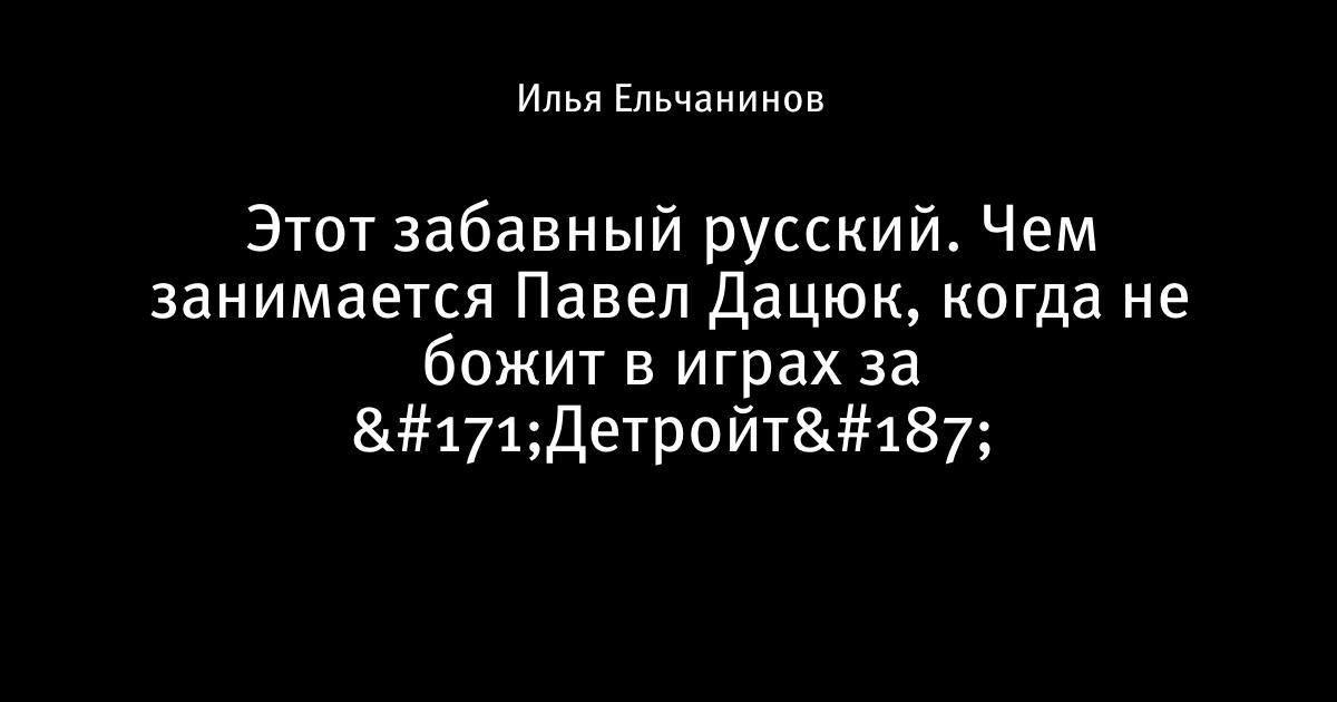 17 декабря 2010, 00:29 Этот забавный русский. Чем занимается Павел Дацюк, когда не божит в играх за «Детройт» Павел Дацюк дерётся с Зеттой, страдает амнезией и, конечно, шутит. Автор Илья Ельчанинов Этот пост опубликован в блоге на Трибуне Sports.ru. Присоединяйтесь к крупнейшему сообществу спортивных болельщиков! Другие посты блога Айс-ТВ