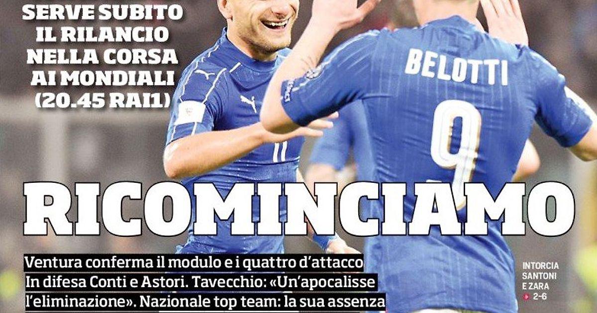 Как в кино: после поражения от Испании, президент FIGC использует резкие тона. И этим вечером матч Италия-Израиль. Буффон: «Давайте сразу поднимемся». Тавеккьо: «Мы не попадём на Мундиаль? Это будет апокалипсис…». Вентура: «Серьёзные слова. Возможно, использую некоторых других игроков».