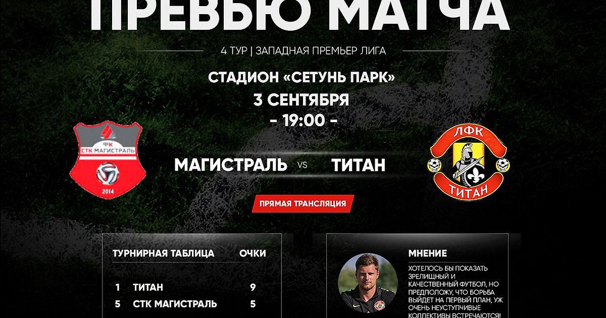 Сегодня матчем между «Москвой» и «ТрансКонтейнером» стартовала программа 4-го тура Западной Премьер-Лиги. Также вечером в субботу состоится перенесённая игра 1-го тура, в которой сыграют «Веер 2010» и «АФК Портер». Ещё пять встреч 4-го тура будут сыграны в воскресенье. Центральным матчем этого уик-энда смело можно назвать поединок бывшней и нынешней команд Игоря Крыжановского - «Магистрали» и «Титана», который состоится воскресным вечером.