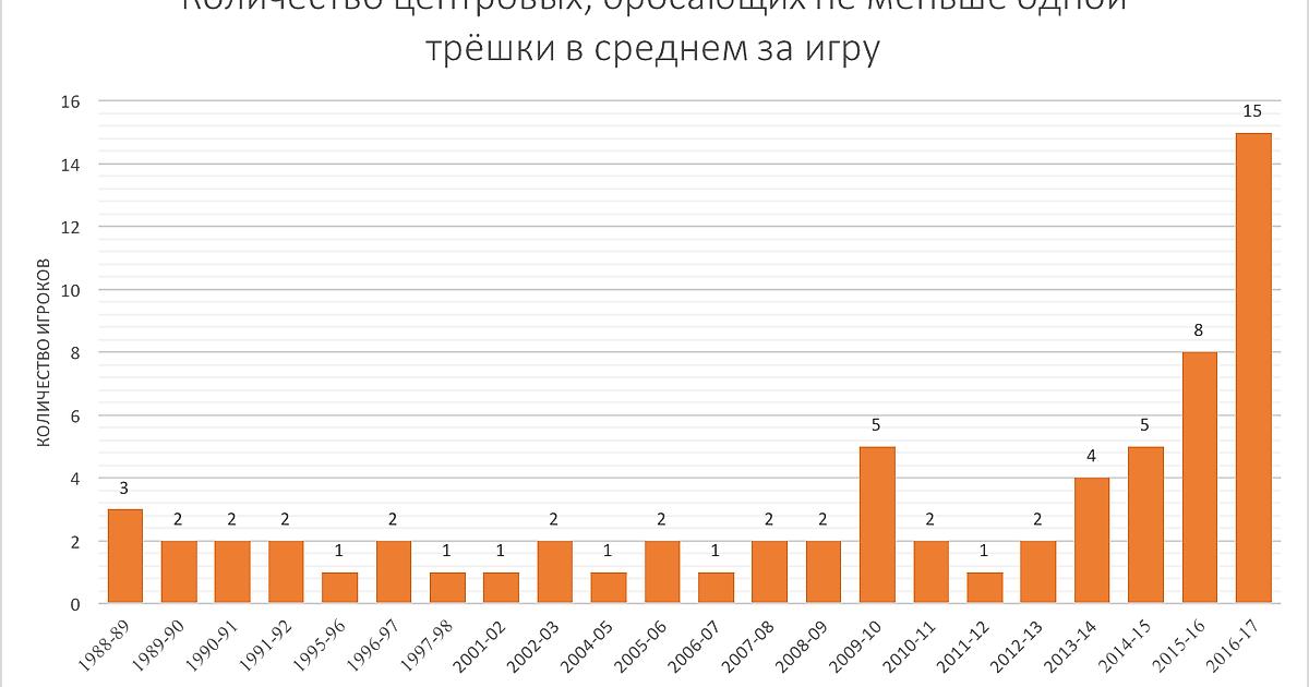 За последние три года количество бросающих центровых выросло в три раза и достигло 15 игроков: