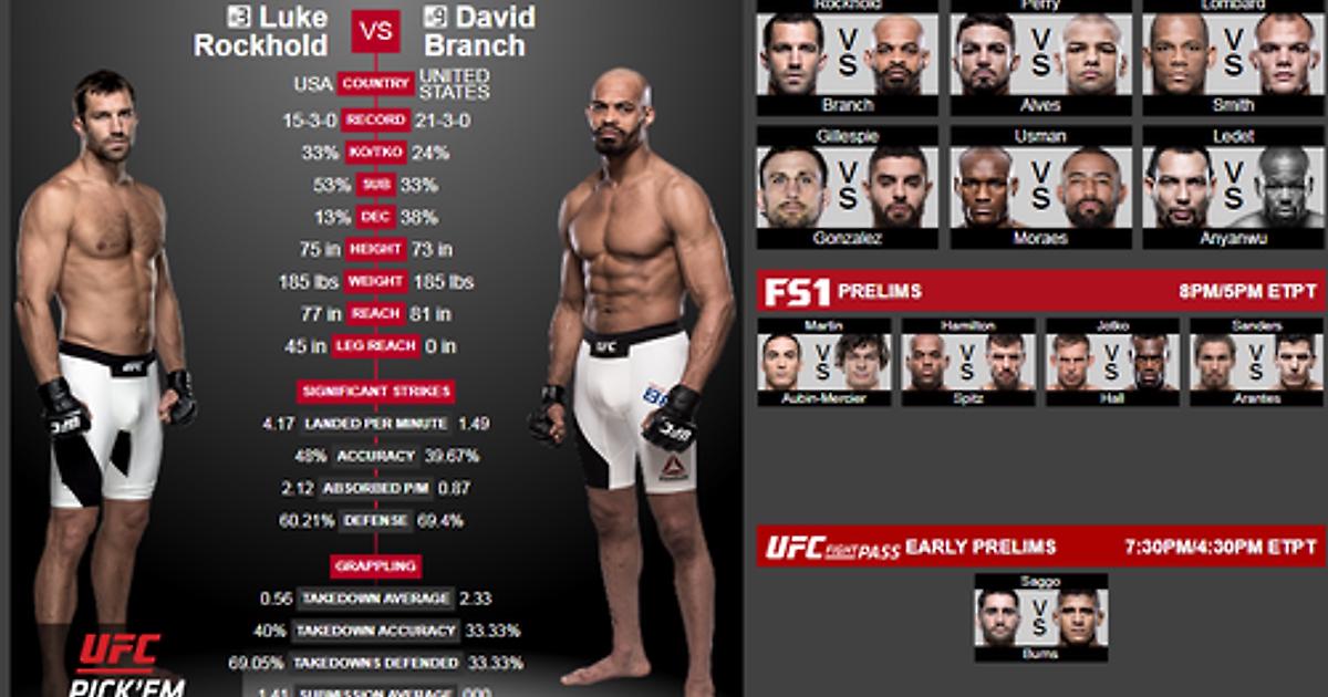 #3 Люк Рокхолд (США, 5-2 в UFC) vs #9 Дэвид Бранч (США, 3-1 в UFC, 1-0 после возвращения), до 84 кг\ Middleweight