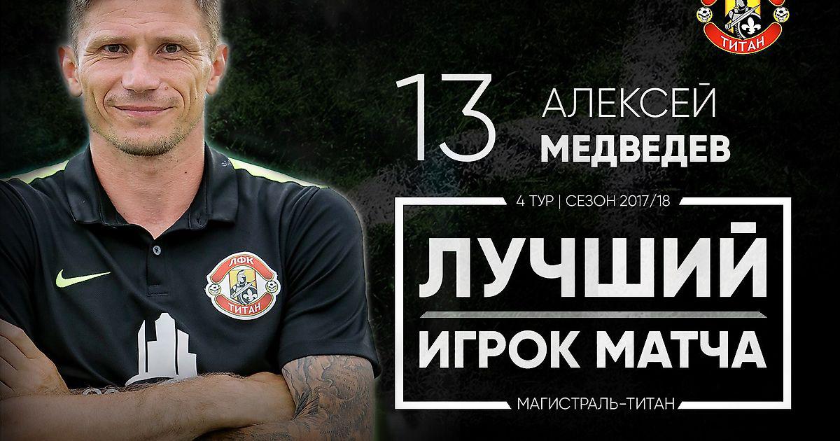 Болельщики и пресс-служба ЛФК «Титан» признали нападающего Алексея Медведева лучшим игроком команды в матче 4-го тура Западной Премьер-Лиги против команды «СТК Магистраль»! Напомним, что эта встреча завершилась победой «чёрно-зелёных» со счётом 0:4.