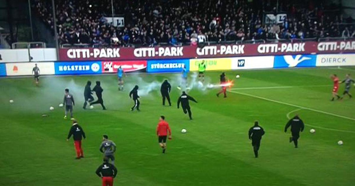 Неприятности начались, когда домашние болельщики штурмуют поле и прорываются, к гостевому сектору фанатов Санкт -Паули. Во время хаоса болельщики Санкт -Паули теряют свой флаг или часть флага, но фаната ловят игроки Холштайна Кильский и вернули тряпки фанатам Санкт -Паули. В прошедшие выходные ультрас Киля были атакованы неизвестными перед родным стадион.
