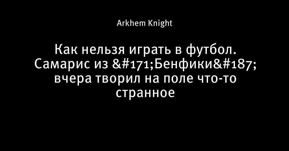 21 сентября 2017, 15:37 Как нельзя играть в футбол. Самарис из «Бенфики» вчера творил на поле что-то странное Автор Arkhem Knight Этот пост опубликован в блоге на Трибуне Sports.ru. Присоединяйтесь к крупнейшему сообществу спортивных болельщиков! Другие посты блога Индиан Хилл Бенфика Андреас Самарис