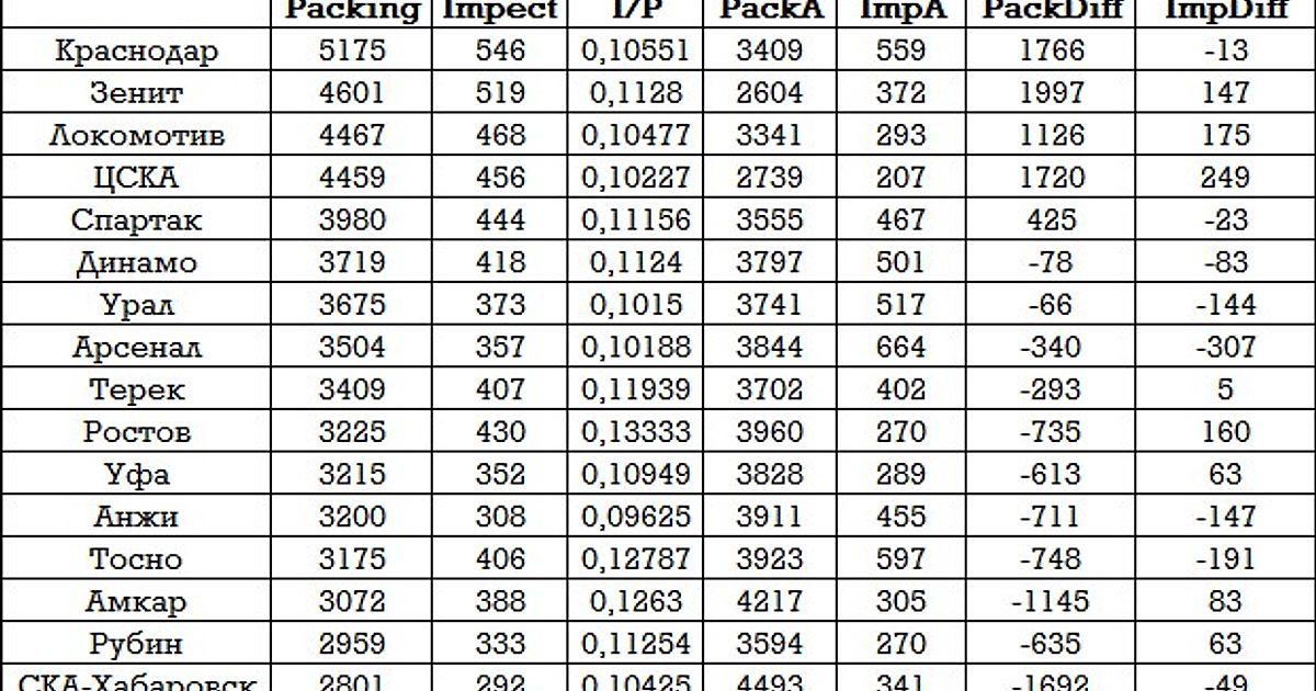 Использована инфографика МатчТВ, таблицы из пабликов Блокнот и Пыльный чердак. Почитать что такое Packing, Impect и почему это важно, можно здесь.