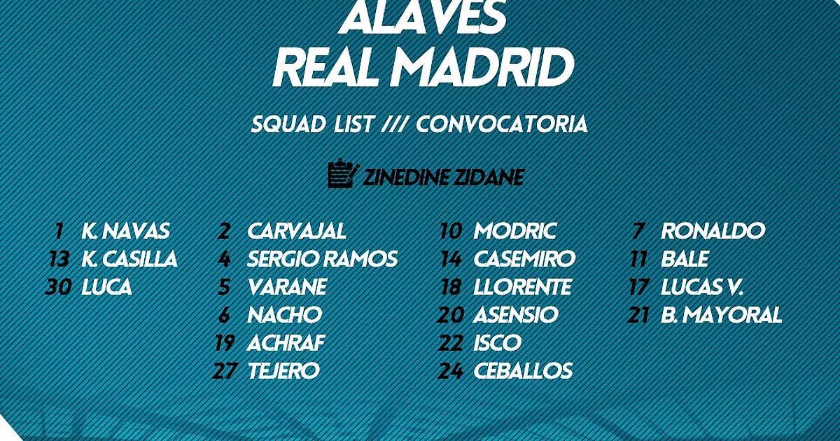 На игру в "Алавесом" тренерский штаб вызвал 19 игроков. Встречу из-за травм различной степени тяжести пропустят Марсело, Тео Эрнандес, Хесус Вальехо, Тони Кроос, Матео Ковачич и Карим Бензема. В свою очередь, в заявку Королевского клуба вернулись Ашраф Хакими и представляющий «Кастилью» Альваро Техеро.