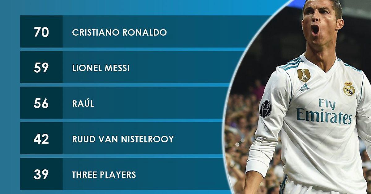 Криштиану Роналду забил в 70 различных матчах Лиги чемпионов (без учета квалификации) - это больше чем любой другой игрок.