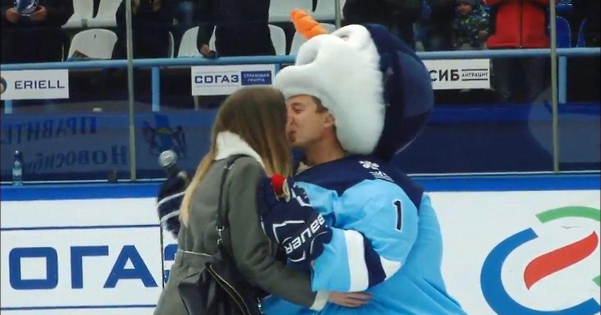 Парень переоделся в маскота «Сибири», позвал девушку на лед и сделал ей предложение у всех на глазах