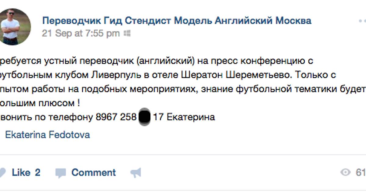 Наверняка все слышали про фейл переводчицы на прессухе «Спартак» – «Ливерпуль». Так вот, зайдя на ее страницу vk (ее id лежит в открытом доступе уже почти день), я обнаружил в топе подписок интересную группу «Переводчик Гид Стендист Модель Английский Москва» с 7000 подписчиков. В таких группах обычно сидят люди, у которых не хватило мозгов завести себе профиль на любой бирже фриланса и мониторить вакансии там. Короче, порог вхождения в этих группах довольно низок. Так вот, вбив в поиск по стене группы слово «ливерпуль», я нашел ОЧЕНЬ ЗАНЯТНОЕ ОБЪЯВЛЕНИЕ (на скриншоте). Автор этого объявления работает в тур-агентстве, в которое, судя по всему, обратился за помощью «Ливерпуль». Дальнейшее развитие событий представить довольно легко.