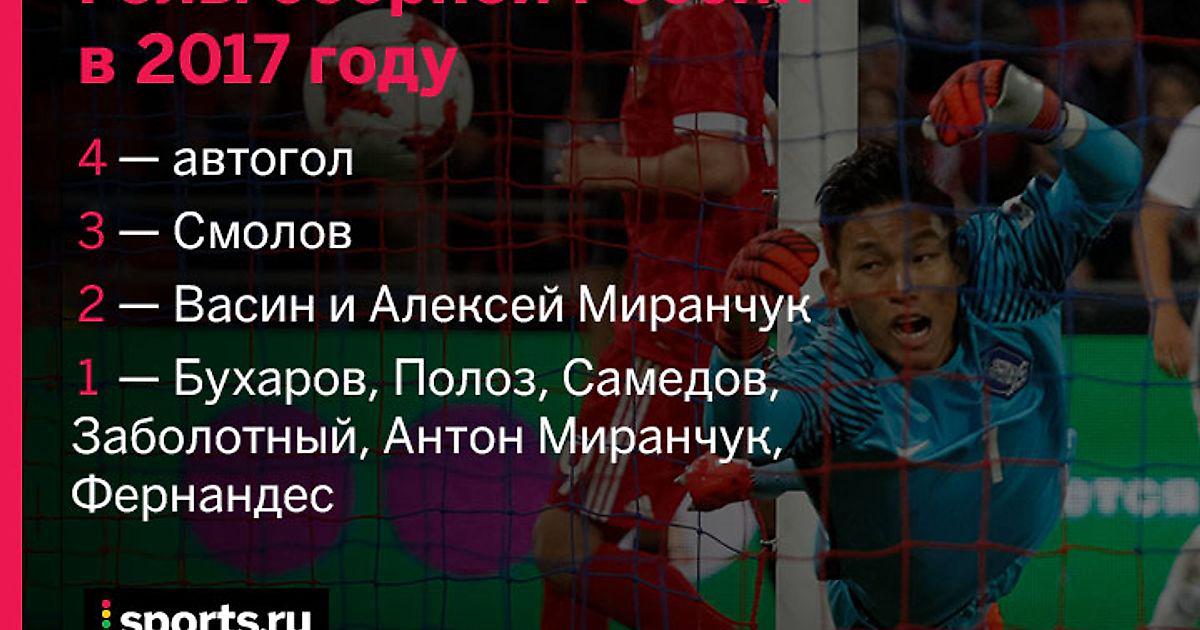 Всего в 2017 году сборная России забила 17 раз, из них 4 – это автоголы. То есть 23,5% мячей России были забиты соперниками в свои ворота.