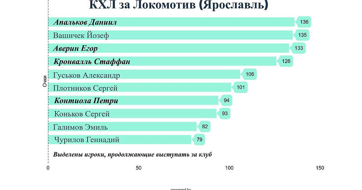 Набрав во вчерашнем матче против Нефтехимика (Нижнекамск) 2 очка (1+1) Даниил Апальков со 136 очками (55 шайб + 81 голевая передача) в 293 матчах за Локомотив (Ярославль) вышел на первое место по набранным очкам в регулярных чемпионатах КХЛ. Наши поздравления!