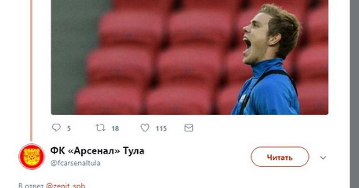 Перед матчем с «Арсеналом» питерский клуб опубликовал в твиттере картинку, на которой большой тульский пряник летит в открытый рот Александра Кокорина. Аккаунт болельщиков «Арсенала» ответил в реплаях, что «рот маловат». А потом клуб из Тулы обыграл «Зенит».