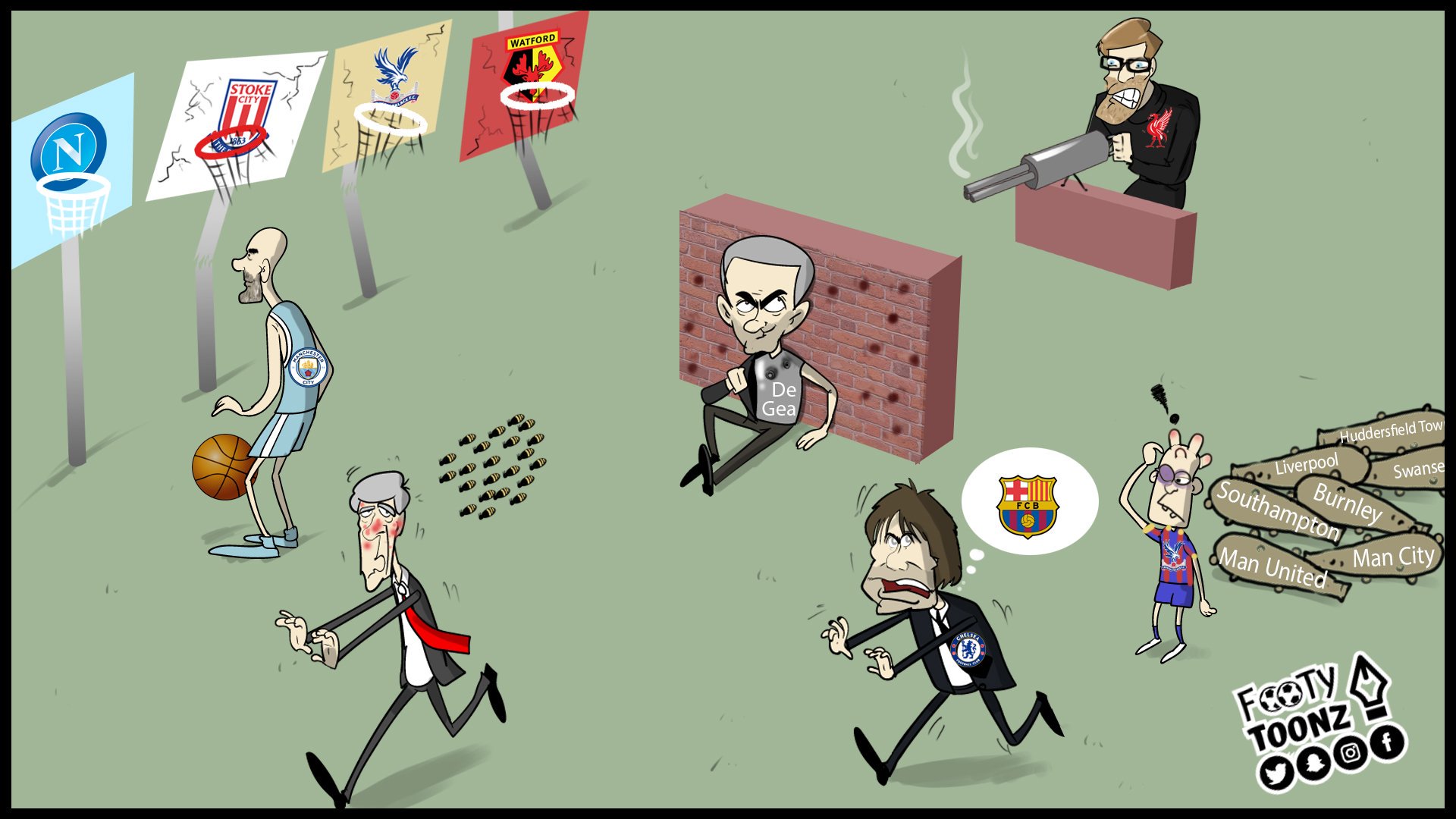 lewton Пулемет Клоппа убрать гораздо дальше, в стенке оставить одно отверстие. У ног Клоппа нарисовать не сдетонировавшую гранату с лицом Лукаку (кольцо от гранаты естественно у Маура). И будет точная иллюстрация к матчу. 17 октября 2017, 16:40 +11 Ответить