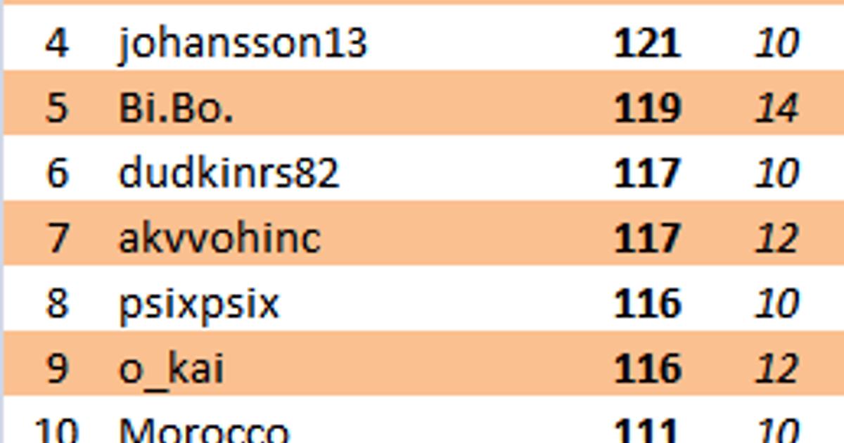 В Италии тандем лидеров сформировали alexkum и o_kai (по 24 очка)