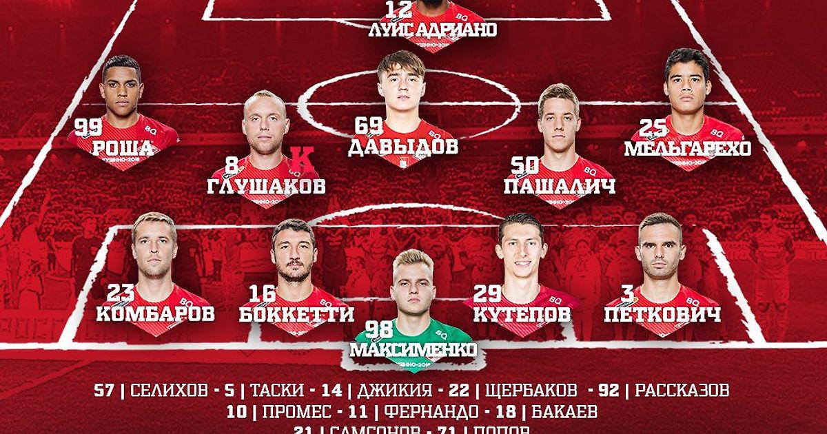 «Спартак»: Максименко, Петкович, Кутепов, Боккетти, Комбаров, Пашалич, Глушаков (к), Мельгарехо, Педро Роша, Давыдов, Луис Адриано.