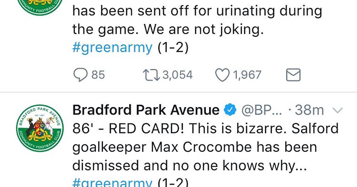 Вратарь «Солфорда» справил малую нужду прямо на поле и был удален