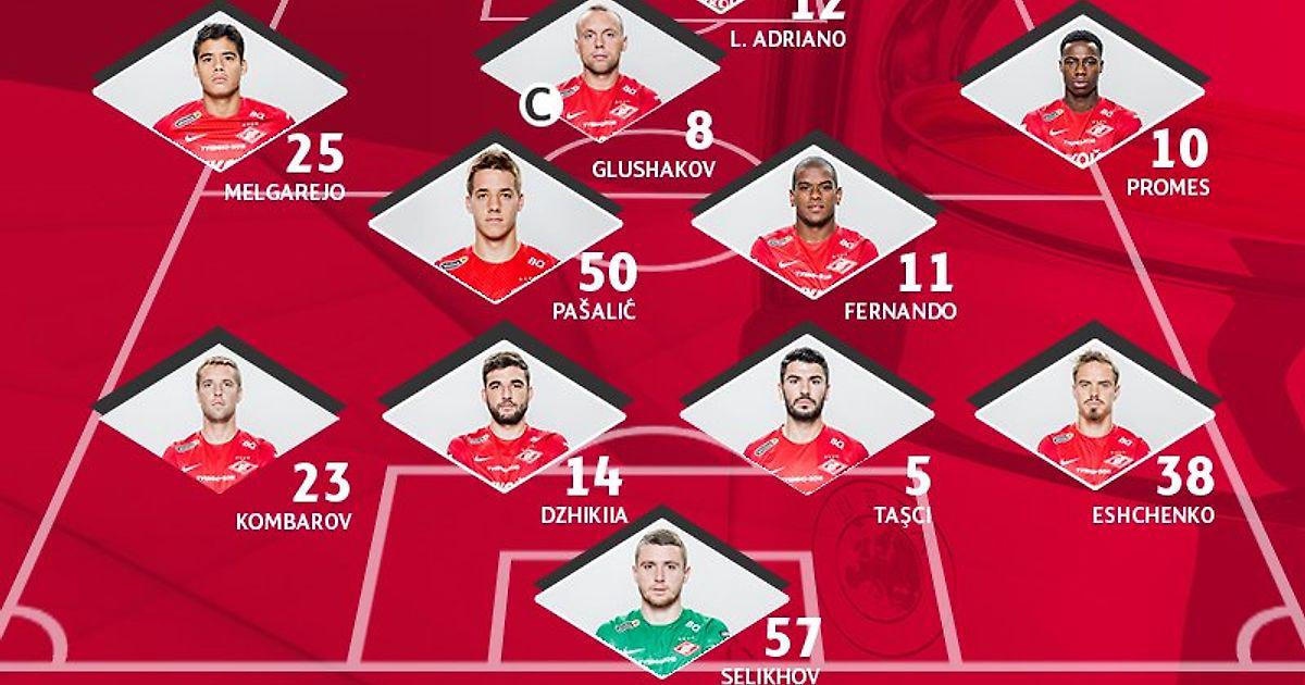 «Спартак»: Селихов, Ещенко, Таски, Джикия, Комбаров, Фернандо, Пашалич, Промес, Глушаков (к), Мельгарехо, Луис Адриано.