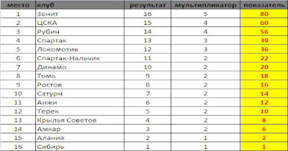 Таким образом, формула определения самой эффективной команды приобретает следующий вид: Р=П/Б*Т, где Р - рейтинг, П - показатель из предыдущей таблицы, Б - бюджет, Т - процент заполняемости трибун.