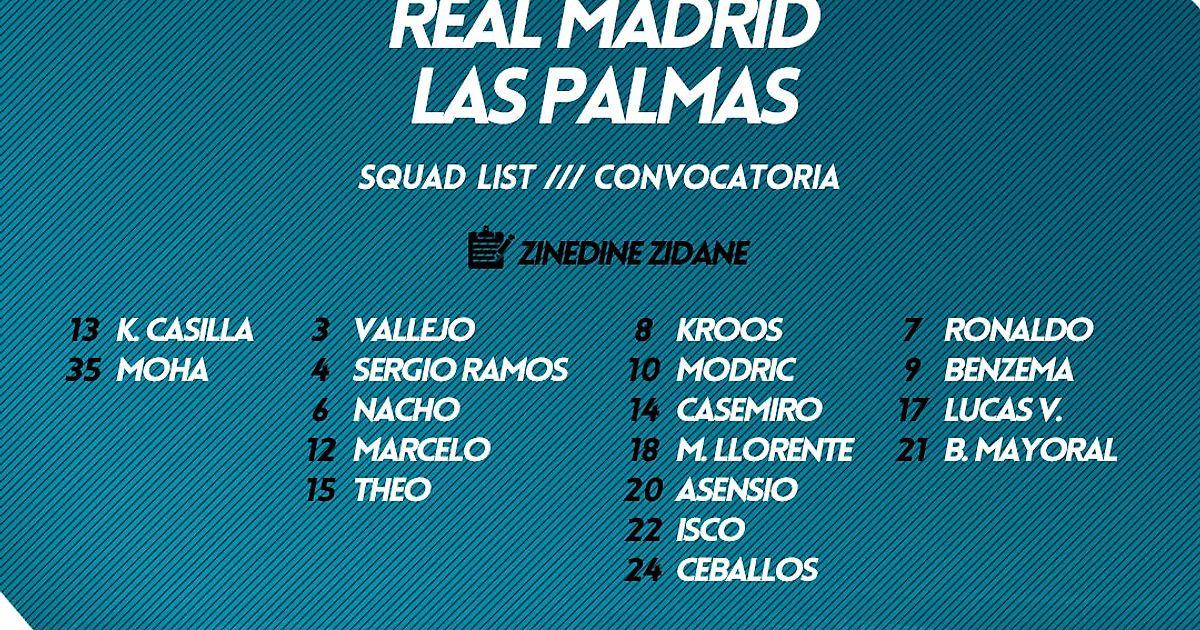 На матч 11 тура Чемпионата Испании тренерский штаб вызвал 18 футболистов. Вне заявки остался Ашраф, а также травмированные Навас, Ковачич и приступившие к тренировкам Карвахаль с Бэйлом.