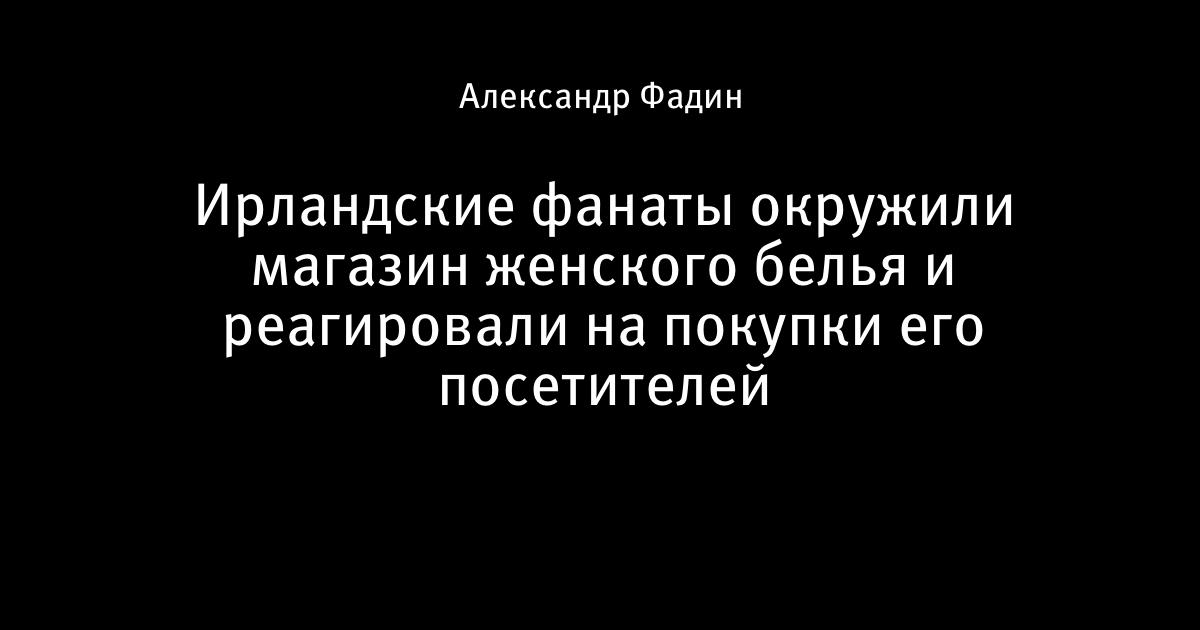 12 ноября 2017, 09:35 Ирландские фанаты окружили магазин женского белья и реагировали на покупки его посетителей Так они развлекались перед стыковым матчем против Дании (0:0) Автор Александр Фадин болельщики происшествия сборная Ирландии по футболу