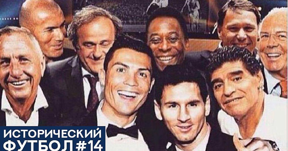 Роналду решил сделать селфи на память: Месси, Зидан, Платини, Пеле, Ван Бастен, Беккенбауэр, Кройф, Марадона, а за ними образ Ди Стефано. Вручение Золотого мяча 2013.